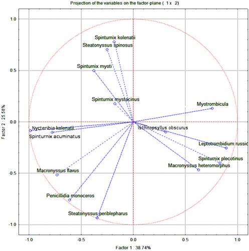 Пространственная проекция видов клещей и насекомых в зависимости от главных факторов, выявленных методом PCA, подтверждает наше предположение, что в сообществе эктопаразитов рукокрылых установились такие взаимосвязи, которые обусловливают успешное существование всех видов без выраженной конкуренции. Так, на рис. 1 и 2 видно, что каждый вид имеет свою позицию в факторном пространстве. Их пространственное размещение указывает на то, что факторы, влияющие на системы, в процессе их эволюции не только сбалансировали численности популяций паразитов, но и каждый вид имеет свою нишу.
