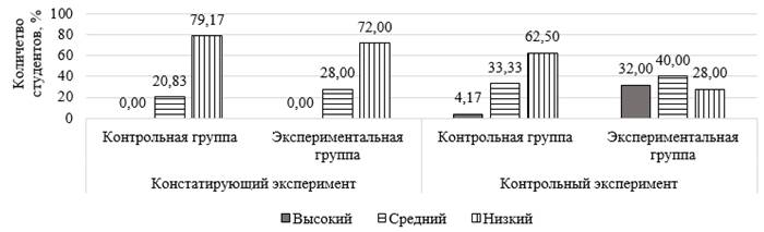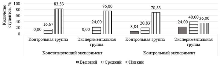 Данные диаграммы (рис. 3) показывают, что в результате эксперимента у студентов экспериментальной группы значительно возрос уровень сформированности стрессоустойчивости и социальной адаптации, количество студентов контрольной группы с низким уровнем более чем в 2 раза превышает количество студентов с таким же уровнем сформированности стрессоустойчивости и социальной адаптации в экспериментальной группе.