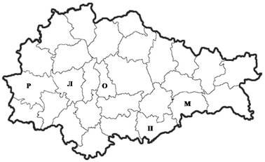 Рисунок 1 – Географическое положение исследуемых популяций колорадского жука: Р – Рыльский район, Л – Льговский район, О – Октябрьский район, П – Пристенский район, М – Мантуровский район