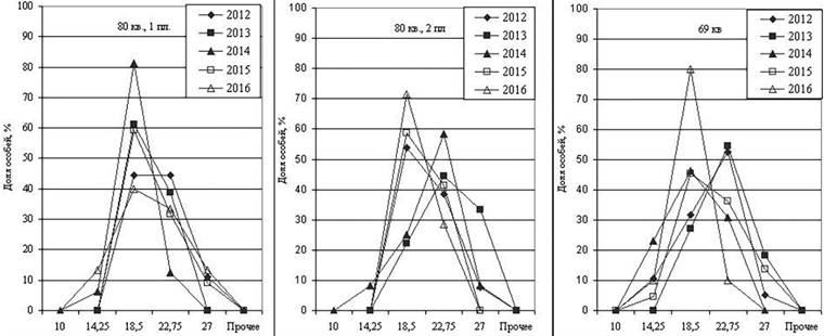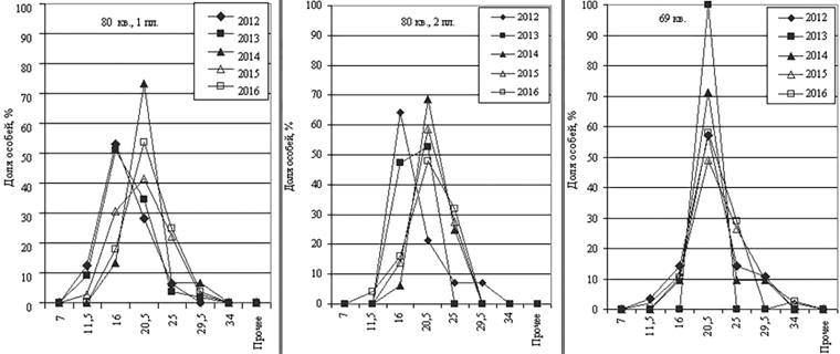 Для популяционной группы квартала 69 (рис. 1) преобладающие значения длины коробочки растений слабо изменялись в зависимости от года вегетации. Все вегетационные сезоны 2012–2016 гг. распределение носило одновершинный характер, все сезоны преобладали растения с длиной плода около 20,50 мм (в 2013 г. они составили всю выборку растений). Формирование крупных плодов в данной популяционном группе в течение продолжительного времени может говорить о том, что условия квартала 69 благоприятны для вегетации рябчика шахматовидного, именно в данной ценопопуляции были отмечены особи с максимальной для всей выборки длиной плода в 33,52 мм.