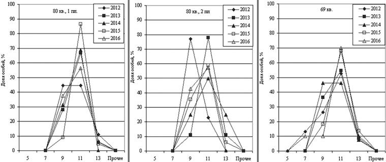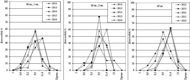 У растений в популяционной группе первой учетной площади квартала 80 в 2012–2016 гг. наблюдалось одновершинное распределение показателя, в 2012, 2015 и 2016 гг. преобладающую долю выборки составили особи с шириной плода около 9,00–10,00 мм, в 2013–2014 гг. – с шириной плода 11,00–12,00 мм. У растений популяционной группы второй учетной площади в 2014–2016 гг. наблюдалось одновершинное распределение показателя ширины плода, в 2014 и 2015 гг. преобладали растения с шириной плода 9,00–10,00 мм, в 2016 г. – с шириной плода 11,00–12,00 мм. В 2013 г. около 35% выборки составили особи с шириной коробочки около 9,80 мм, ок. 15% – с шириной коробочки 11,00–13,00 мм. В 2013 г. явно преобладали растения с шириной плода 9,00–10,00 мм (ок. 80%), около 10% составили особи с шириной плода 6,60–8,20 мм.