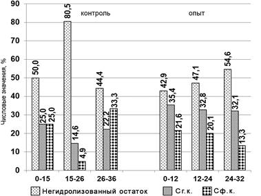 Рисунок 1 – Содержание негидролизованного остатка, углерода гуминовых и фульвокислот на вырубках (в %) после сплошных рубок ельника кисличного, контроль – почва без экскрементов; опыт – почва с разлагающимися экскрементами