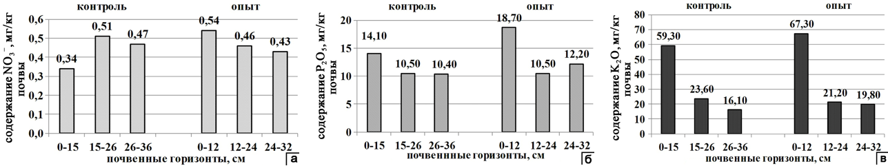 Содержание компонентов агрохимического комплекса имеет способность к росту на протяжении всего периода разложения. Повышение содержания нитратного азота, фосфата и калия через 6 месяцев наблюдается, в основном, в самом верхнем горизонте (рис. 2).