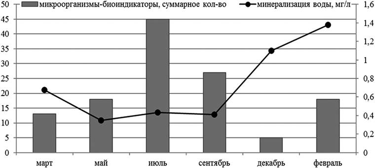 В ходе исследования были также установлены скачки минерализации в зимний период (декабрь 2017 г. и февраль 2018 г.), что не характерно для данного времени года. Такое явление, возможно, обусловлено повышением количества сине-зеленых водорослей, сменивших тип питания ввиду присутствия в водоеме в большом количестве органических веществ.