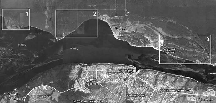 Рисунок 1 – территория Заволжья с отмеченными на нем участками, на которых проводились исследования: 1 – «Ландыш», 2 – «Сосновка», 3 – «Росинка»