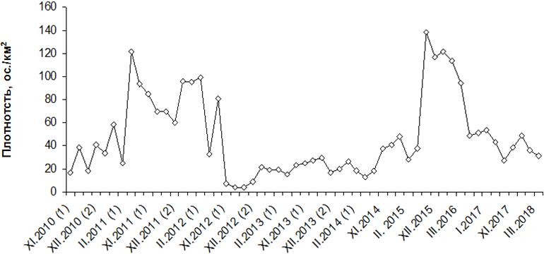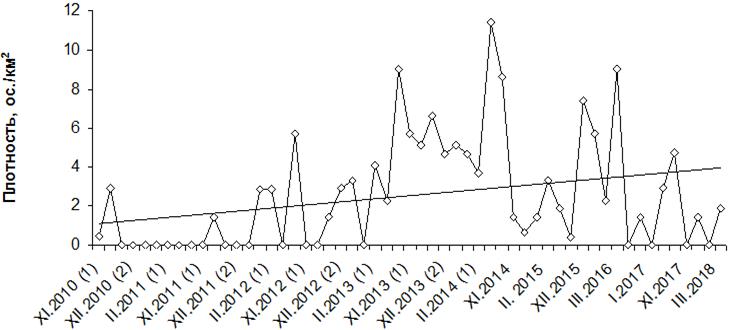 Рисунок 2 – Динамика плотности желны на участке «Росинка» в зимние периоды 2010–2018 гг.
