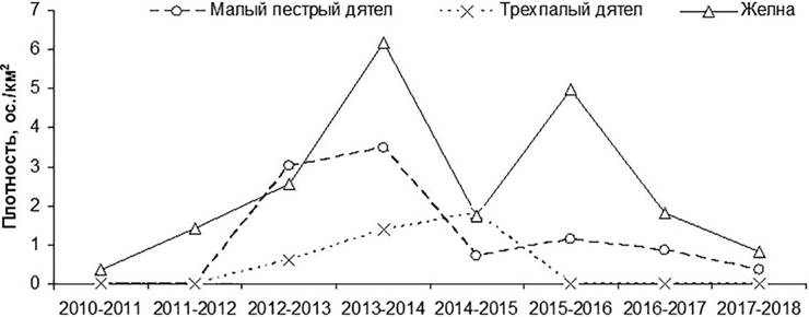 Рисунок 3 – Динамика средней зимней плотности малого пестрого дятла, трехпалого дятла и желны