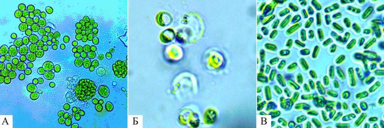 Рисунок 1 – Микрофотографии культур фотобионтов из лишайника Cladonia arbuscula, произрастающего в Оренбургской области: А – Asterochloris sp.; Б – Chlorella sp.; В – Stichococcus sp. Увеличение ×280 (А), ×400 (Б, В)