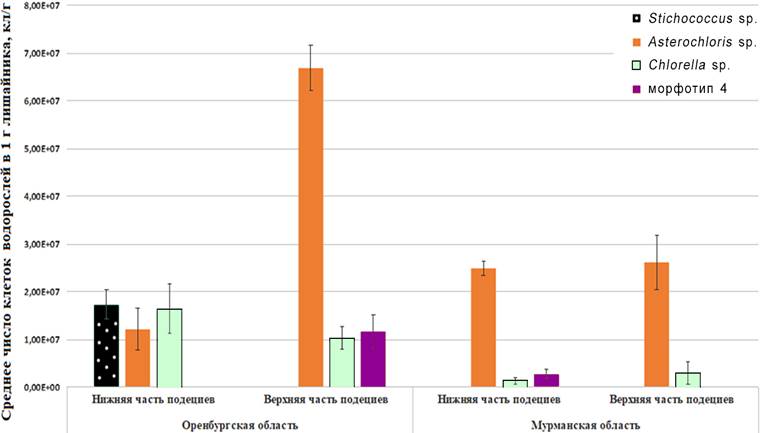 Главная закономерность, которая прослеживалась во всех видах лишайников обеих географических зон – доминирование водорослей рода Asterochloris в верхушечной, активно растущей зоне подециев. Особенно хорошо это заметно в лишайниках из степной зоны, в частности C. arbuscula (рис. 2), в которых численность клеток водорослей этого рода достигала уровня 6·10⁷ кл/г, в то время как в северотаёжных лишайниках численность была не выше 3·10⁷ кл/г. Это можно объяснить более высокими потребностями микобионта в органических веществах на фоне значительно более высоких температур вегетационного периода, а также значительным уровнем инсоляции в степной зоне.