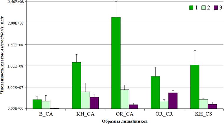 Динамика изменения численности фотобионтов в образцах лишайников из Мурманской области, Хибин и Оренбургской области в целом остается такой же. Наименьшая абсолютная численность Asterochloris минимальна в образцах лишайника C. arbuscula, отобранных на территории ББС МГУ (сфагновое болото), а максимальна – в образцах из Бузулукского бора, средние значения демонстрируют образцы, собранные в горных экосистемах Хибин (рис. 3).