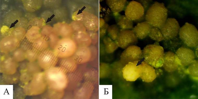 В ряде образцов лишайников из Мурманского региона в гомогенатах верхушечных частей C. rangiferina наряду с главным фотобионтом присутствовали клетки Pseudococcomyxa. Количество этих клеток увеличивалось пропорционально степени деструкции таллома (данные не показаны).