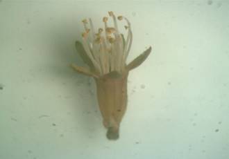 На стадии «розовый рыхлый бутон» заметно довольно быстрое увеличение всех структур цветка: лепестки в два раза превышают длину чашелистиков (рис. 11), тычиночные нити, распрямляясь, выносят тычинки наружного круга почти к рыльцу пестика (рис. 12, 13).