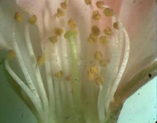 Строение фертильных частей цветка следующее. Андроцей представлен расположенными в два условных круга (наружный и внутренний) свободными околопестичными до начала цветения загнутыми внутрь цветка тычинками в количестве от 21 до 29 шт., которые прикрепляются к краю гипантия с внутренней стороны (рис. 2). Расхождение тычинок происходит во время цветения. Относительно друг друга они неравные. Тычиночная нить по характеру поверхности голая, по форме – шиловидная. На вершине тычиночной нити неподвижно прикреплен яйцевидный (сердцевидный) пыльник с двумя теками – половинками пыльника (рис. 3). Вскрывается пыльник по бокам – продольно.