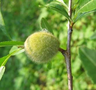 Плод A. nana – яйцевидная, опушенная костянка с хорошо различимым брюшным швом (рис. 18). Плоды одиночные, в начале плодоношения – зеленые, по мере созревания становятся песочного цвета, с конца июля твердеют. Плодоношение охватывает период с начала первой – второй декад июня до второй декады сентября в зависимости от погодных условий года исследований, сроки начала и завершения данной фазы развития изменяются в пределах 7 дней. Плоды остаются на растении в течение всего зимнего периода, их растрескивание происходит только следующей весной. Число плодов в период изучения было незначительным. К тому же не все из них содержали полноценные семена, некоторые были неспецифических (меньших) для вида размеров. Вероятно, невыполненность семян связана с прохладными условиями в период созревания, а также, по мнению Л.Ф. Яндовка и В.М. Тарбаевой [24, с. 51–58], нарушения процессов эмбриогенеза (как на начальных, так и на поздних этапах) приводят к недоразвитию семязачатков. Исследователи отмечают возможность сброса в определенные периоды онтогенеза значительного числа завязей, что является эволюционным приспособительным эффектом, в результате которого происходит самосохранение растения.