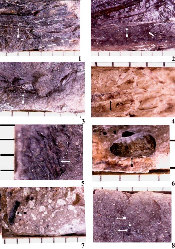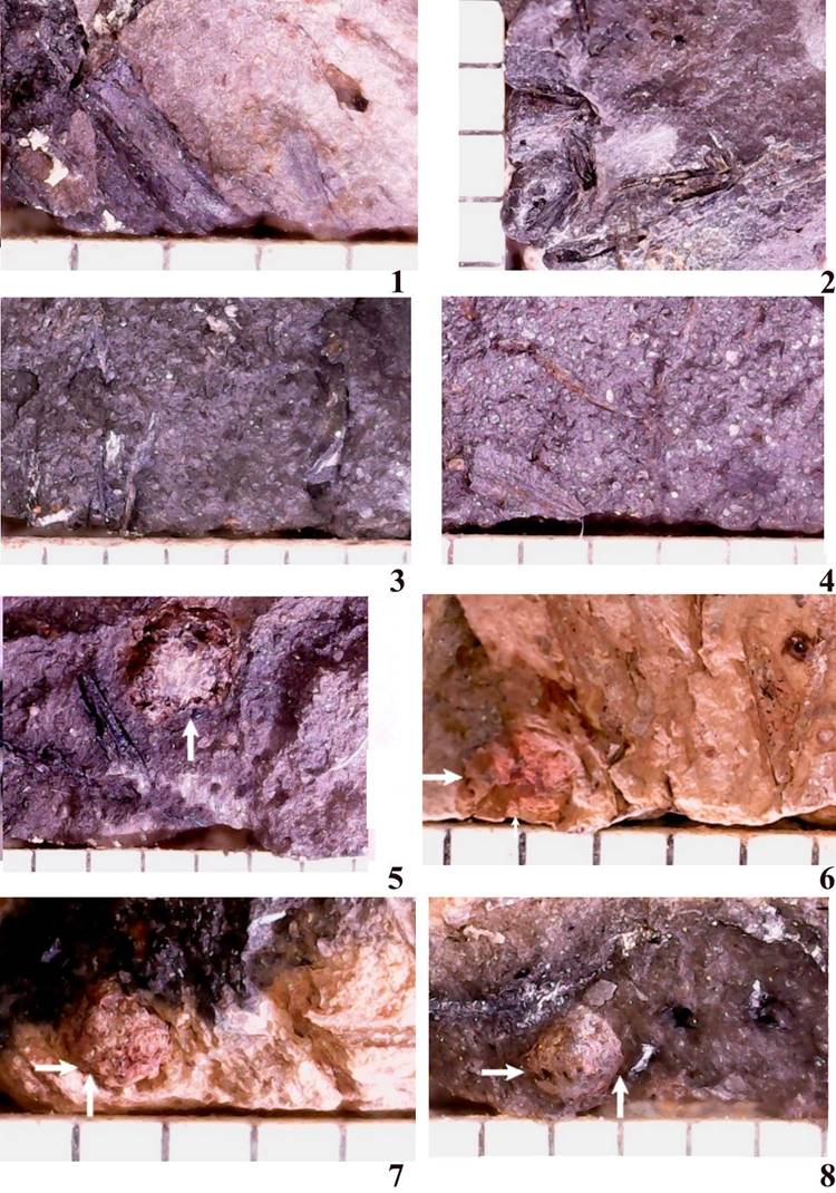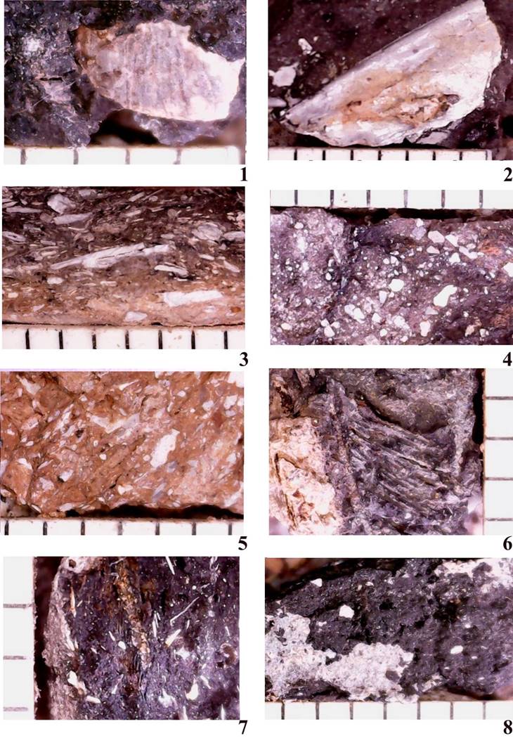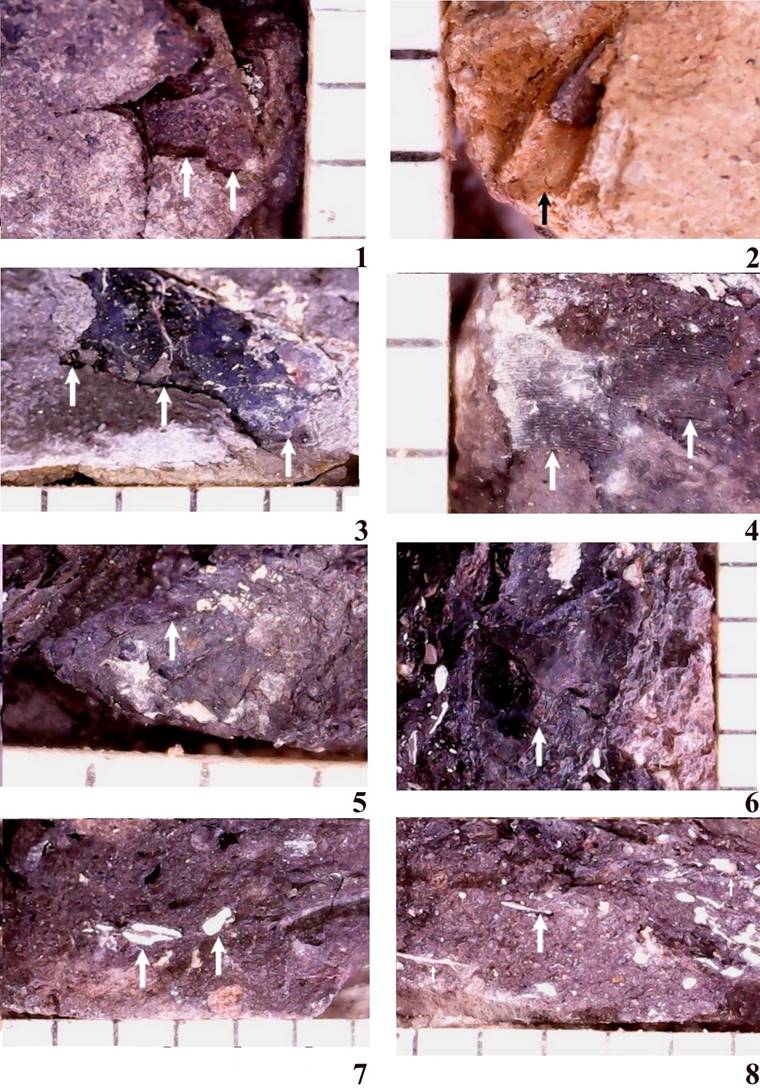 Рисунок 1 – Микрофотосъемка керамики поселения Ракушечный Яр. Остатки растительности в исходном пластичном сырье: 1–6 – в илах; 7–8 – в илистых глинах
