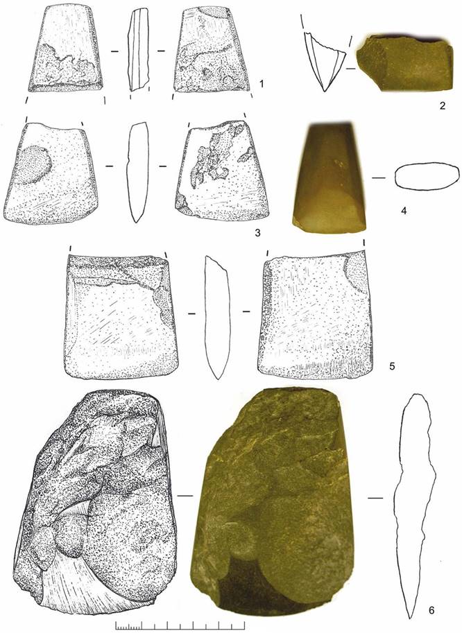 Второй топорик трапециевидной формы сохранился практически целым – поврежден только один край лезвия. Обе поверхности, боковые грани, обушок и лезвие были тщательно отшлифованы, лезвие имеет слегка округлую форму (рис. 3: 4).