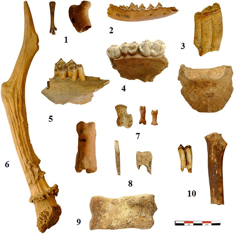 Рисунок 2 – Фаунистические остатки из ранненеолитических слоев поселения Ракушечный Яр. 1 – две кости птицы; 2 – нижняя челюсть лисицы; 3 – нижний M3 и третья фаланга дикой лошади; 4 – фрагмент верхней челюсти кабана; 5 – фрагмент нижней челюсти с M3 и первая фаланга благородного оленя; 6 – рог косули; 7 – таранная кость, первая и вторая фаланги собаки; 8 – резец и фрагмент первой фаланги домашней свиньи; 9 – нижний M2 и фрагмент лучевой кости овцы; 10 – первая фаланга домашней коровы, длина 72 мм