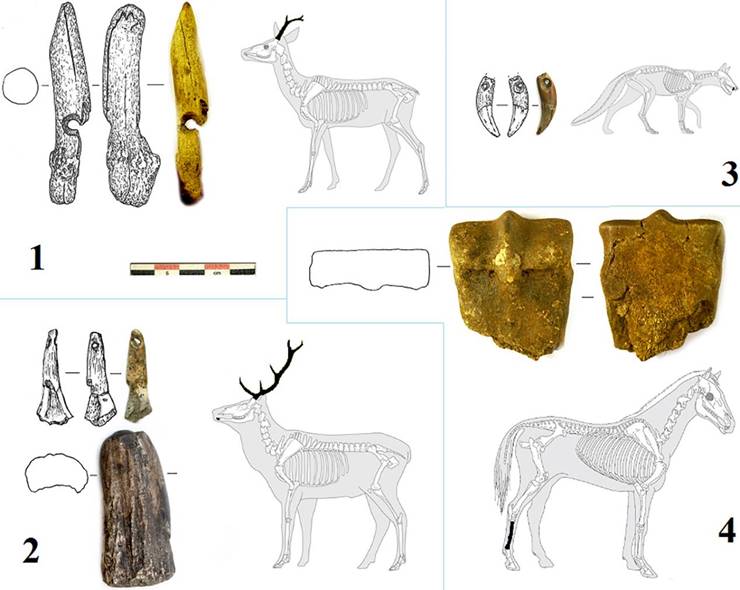 Рисунок 3 – Артефакты из ранненеолитических слоев поселения Ракушечный Яр. 1 – рог косули с отверстием; 2 – обработанный рог и подвеска из резца благородного оленя; 3 – подвеска из клыка лисицы; 4 – фрагмент метаподии лошади со следами стесывания