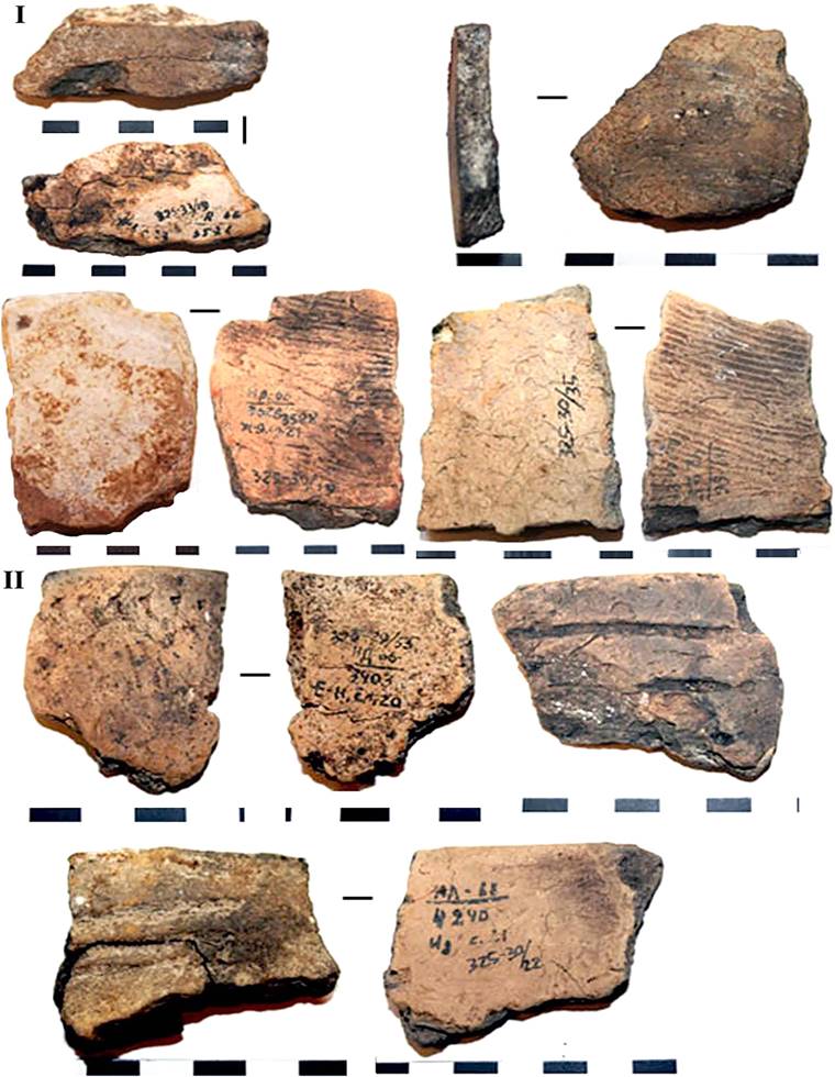 2. Figure 1 - Settlement Rakushechny Yar. Handmade tape molding of ceramics. I - ceramics of 23–21 layers with comb-toothed stamp on the inner surface; II - rims of vessels with an ornament and an inner surface smoothed by hands