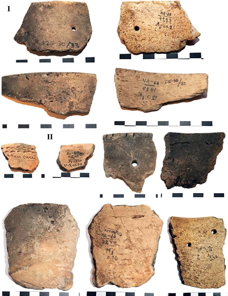 3. Figure 2 - Settlement Rakushechny Yar. Handmade tape molding of ceramics. I - rims of vessels of 21 layers with a hole and notches along the edge of the cut. The inner surface is smoothed; II - 20 layer ceramic with ornaments, drilled holes and hand smoothed inner surface