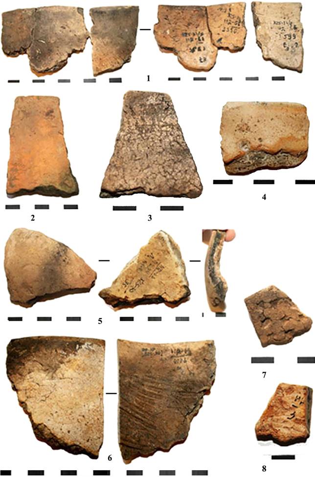 4. Figure 3 - Settlement Rakushechny Yar. Vessels rims of 23–20 layers. All rims - 1–4, 6, 8 - have a straight flat-cut U-shaped top, sometimes with grinding; 5 - a fragment with the inner surface smoothed by hands; 7 - the ornament is applied to the dried surface, has a clear border of the ornamental print and microcracks around