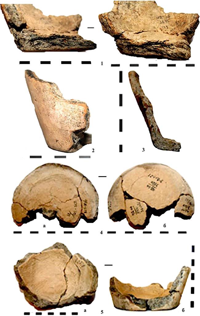 5. Figure 4 - Settlement Rakushechny Yar. Flat bottoms of the vessels of the 20th layer. 1 is a side view and a plan view of the broken part of the bottom. Hand molded, loose dough, stratified; 2 - flat bottom made by a combination of hand molding and subsequent punching with a wooden mallet; 3 - flat bottom made on the base form; 4 - hand molding of the bottom with a distinct imprint of the peeled tape: a - view from the inside in plan; b - bottom view from the outside in plan; 5 - hand molding and subsequent smoothing of the inner surface with a toothed stamp: a - view from the inner side in plan; b - side view on the bottom