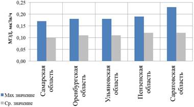 Как видно из рис. 1, на территории Самарской области максимальное значение МЭД зарегистрировано в июне на ОГМС Самара и составляло 0,17 мкЗв/ч. Среднегодовая величина МЭД по Самарской области не превышала 0,10 мкЗв/ч. На МС Айдырля Оренбургской области максимальная величина МЭД γ-излучения зафиксирована в мае на уровне 0,18 мкЗв/ч, среднегодовая составляла 0,11 мкЗв/ч. На территории Ульяновской области максимальное значение МЭД не превышало 0,18 мкЗв/ч и было отмечено на нескольких станциях: МС Канадей (в апреле), МС Сенгилей (в сентябре) и на МС Сурское (в декабре). Среднегодовая величина МЭД по Ульяновской области не превышала 0,11 мкЗв/ч. Максимальная величина МЭД γ-излучения на территории Пензенской области зафиксирована на ЦГМС Пенза в июне и октябре на уровне 0,19 мкЗв/ч, среднегодовое значение составляло 0,12 мкЗв/ч. На территории Саратовской области максимальное значение МЭД зарегистрировано в апреле на МС Балаково и составляло 0,23 мкЗв/ч. Среднегодовая величина МЭД по Саратовской области не превышала 0,12 мкЗв/ч.