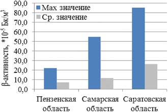 Максимальная концентрация суммарной β-активности в пункте наблюдения ОГМС Самара (Самарская область) обнаружена в августе на уровне 54,6 × 10‾⁵ Бк/м³, среднегодовая составляла 11,4 × × 10‾⁵ Бк/м³ (рис. 2). В пункте наблюдения МС Балаково Саратовской области максимальное значение обнаружено в июле и не превышало 85,2 × 10‾⁵ Бк/м³, среднегодовая величина зарегистрирована на уровне 26,2 × 10‾⁵ Бк/м³ (рис. 2).