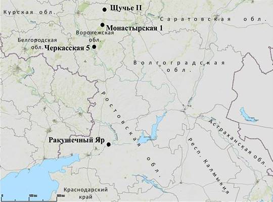 Рисунок 1 – Местоположение опорных памятников ракушечноярской и среднедонской культур