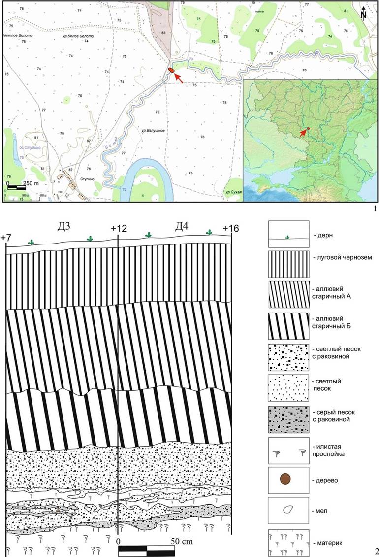 Рисунок 1 – Стоянка Черкасская-5. 1 – карта-схема расположения памятника; 2 – стратиграфия и условные обозначения