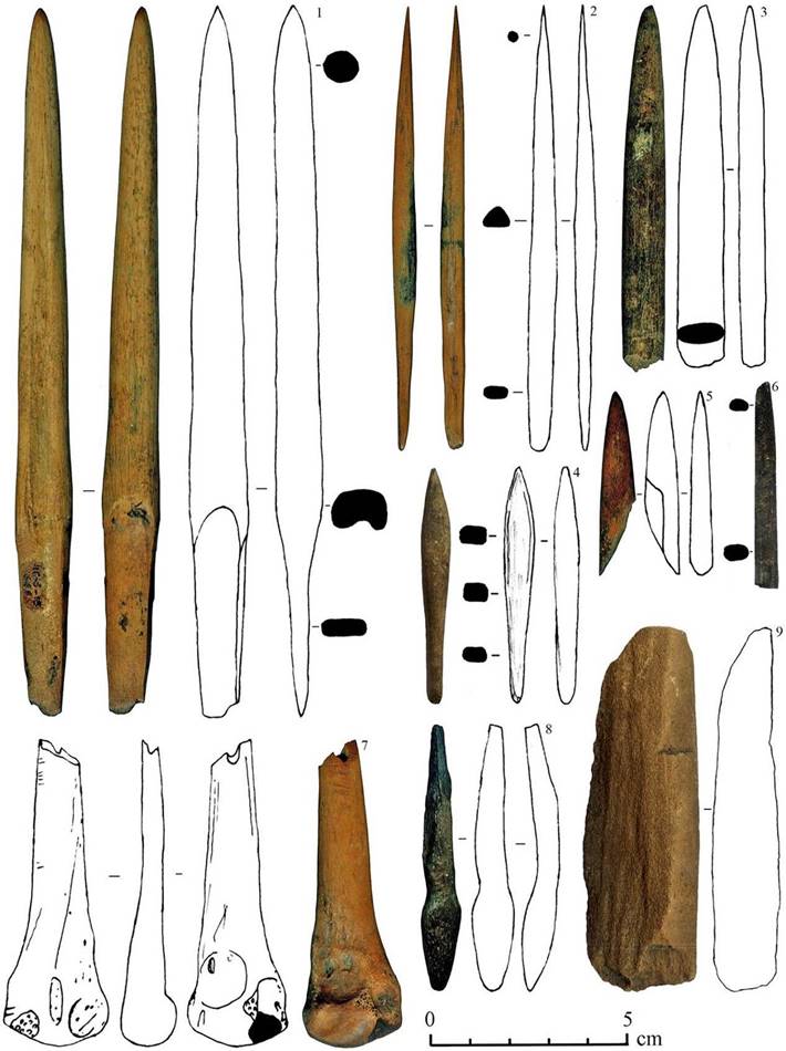 Изделия из кости немногочисленны, представлены наконечниками и остриями, их обломками (рис. 2: 1–3, 5), кочедыком (рис. 2: 7), возможно жерлицей (рис. 2: 4) остальные обработанные находки из кости представлены в обломках, и об их первоначальных размерах и функциях судить трудно (рис. 2: 6, 8). Имеется обломок изделия из рога (рис. 2: 9). Привлекают к себе внимание фрагменты панцирей черепах с нанесенными горизонтальными и вертикальными насечками на внутренней стороне, вероятно, возникшими при разделке.