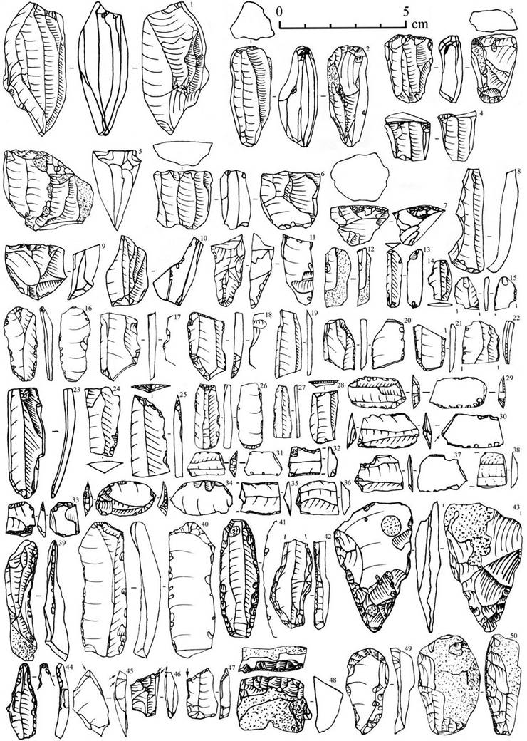 Орудия из камня изготавливались в основном из кремня (черный меловой, реже – валунный цветной, всего 143 ед.). Первичная обработка кремня проводилась за пределами исследованной части стоянки, вторичная – на ее территории, о чем свидетельствует присутствие нуклеусов, нуклевидных обломков и сколов подправки нуклеусов (рис. 3: 8–11), отбойников (рис. 4: 4–7, 9), чешуек. Нуклеусы небольших размеров (до 5 см), пирамидальные (3 экз.), плоские (2 экз.), уплощенные клиновидные (1 экз.) и призматические (1 экз.), прямо- и косо-площадочные, с негативами от пластинчатых заготовок (рис. 3: 1–7). Кремневая индустрия носит ярко выраженный пластинчатый облик. Использовавшиеся пластинчатые заготовки шириной более 1,2 см редки, наиболее характерны пластинки и микропластинки и их сечения, в основном с ретушью, реже – без ретуши (рис. 3: 12–42, 44, 47). К геометрически микролитам можно отнести две низкие трапеции (рис. 3: 30, 31), изделия типа параллелограмма (рис. 3: 29) и типа сегмента с подтеской с брюшка (рис. 3: 34). Часть пластин характеризуются наличием ретуши с брюшка (рис. 3: 15–18, 20, 26, 33, 37). Вероятно, функцию вкладышей выполняли пластины и их сечения, т.к. значительная их часть имеет обработку с брюшка, а некоторым придавалась трапециевидная форма без обработки торцевых граней. Присутствуют скошенное острие (рис. 3: 25) и пластина с притупленным ретушью краем (рис. 3: 28). Орудийный набор включает ножи (4 экз., рис. 3: 39–42), резцы (4 экз., рис. 3: 45–47), скребки (3 экз., рис. 3: 48–50), по одному экземпляру – скобель, перфоратор (рис. 3: 44), проколка. Имеется обломок бифаса (рис. 3: 43). Особенностью орудийного комплекса следует считать малочисленность кварцита – отметим лишь одно сечение пластины без ретуши (рис. 3: 38). Также обнаружены тесла (6) и их обломки (рис. 4: 1–3). Значительный процент изделий со вторичной обработкой занимают абразивы, различные фрагментированные плитки с заполированной поверхностью, отбойники (раздел таблицы 1 «Прочее», рис. 4: 8). Данные о находках из камня приведены в таблице 1.