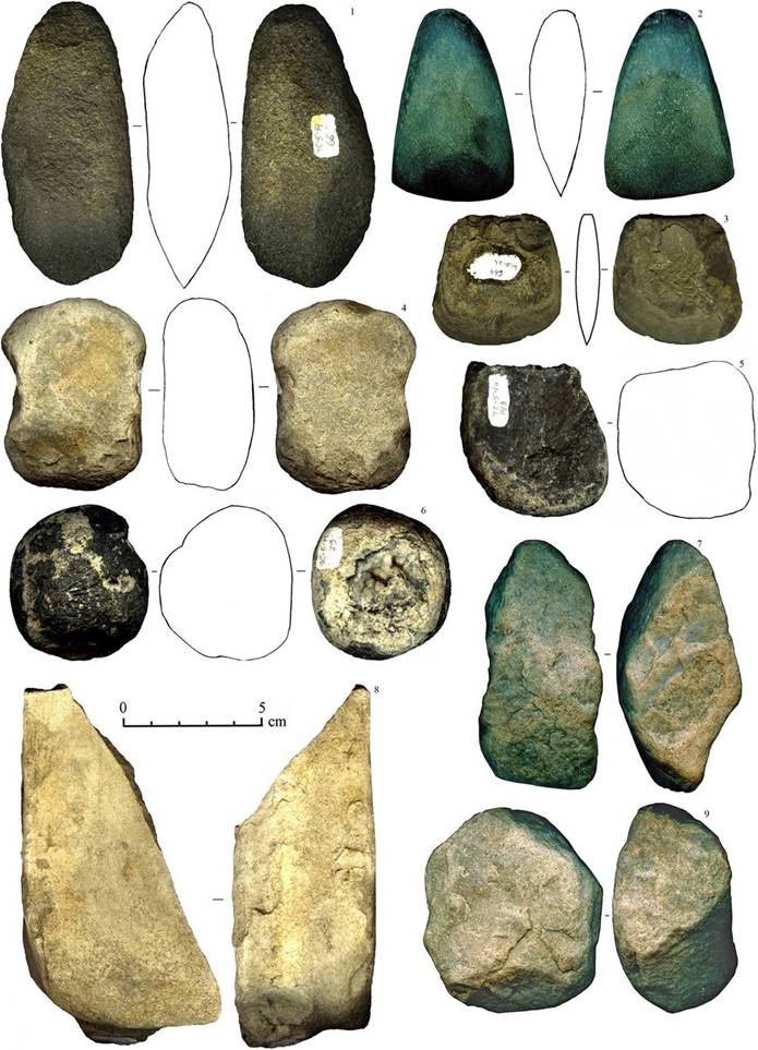 Рисунок 4 – Стоянка Черкасская-5. Орудия для деревообработки (1–3), отбойники (4–7, 9) и фрагмент полированной плиты (8)