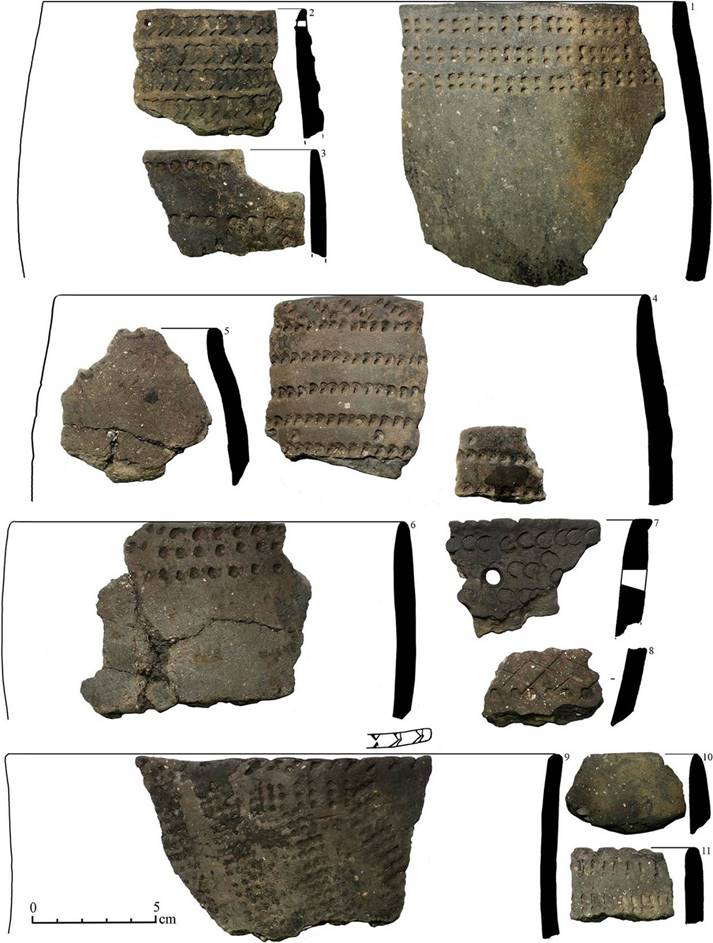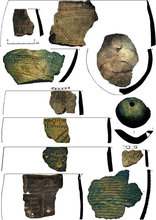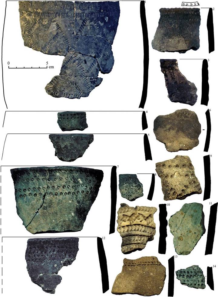Керамика из раскопа делится на четыре группы (всего 294 фрагмента). Керамика первого типа самая многочисленная (215 фрагментов приблизительно от 35–40 сосудов). Характеризуется плотным тестом с обязательной примесью раковины. Поверхности заглажены, иногда до лощения, без расчесов. Сосуды прямостенные, со слегка стянутым верхом, баночной формы. Реконструируемый диаметр сосудов от 30 до 14 см (в среднем – 24–18 см). Срезы венчиков различной формы – в основном приостренные, реже округлые либо уплощенные. Обнаруженные донца (всего два экз.) принадлежали округлодонным сосудам, одно со сквозным отверстием, без орнамента (рис. 6: 4, 7). Встречен крупный фрагмент «ладьевидного» сосуда (миска?) с прочерчено-накольчатым орнаментом (рис. 6: 3). Лишь один сосуд был с ямочным пояском по венчику (рис. 6: 10). Шесть сосудов были с гофрированным либо орнаментированным срезом. Орнамент на керамике покрывал верхнюю и реже – среднюю часть посуды. Орнаментальные композиции представлены как горизонтальными рядами (рис. 6: 2, 4, 8, 9; рис. 7: 2, 4–7, 12–14), так и геометрическими мотивами с треугольными или прямоугольными фигурами, зигзагом, сеткой (рис. 6: 1, 3, 5, 6, 10, 11; рис. 7: 1, 3, 8–11). Орнамент наносился в технике накалывания и прочерчивания, спаренным штампом типа накола (рис. 6: 1, 2, 5, 6, 10; рис. 7: 4, 6, 12, 13), подтреугольным (рис. 6: 4; рис. 7: 2, 5, 8) и «подкововидным» наколом (рис. 6: 8; рис. 7: 3, 7, 14), штампом с рубчатым основанием – возможно, это позвонки рыб (рис. 7: 10), плоским узким штампом (рис. 6: 9; рис. 7: 1, 6). Изредка встречены неглубокие ямчатые вдавления, оттиски панциря улитки (рис. 7: 9), прочерки (рис. 6: 11; рис. 7: 11), иногда в сочетании с наколом (рис. 6: 3). Значительная часть керамики этой группы не имела орнамента (137 фрагментов). Керамику данной группы дополняют фрагменты, поднятые со дна реки во время обнаружения памятника в 2012 г. (рис. 8, 9). Некоторые из них принадлежали сосудам, фрагменты которых позже были расчищены в культурном слое (рис. 7: 10; рис. 9: 5).