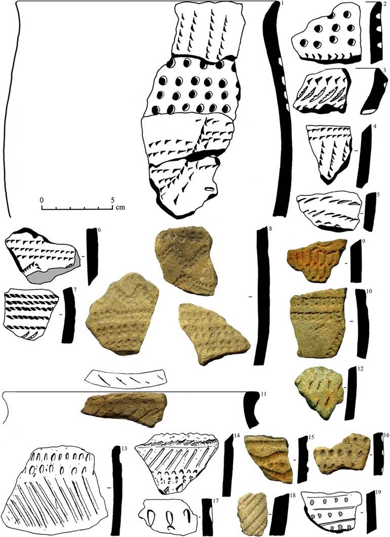 Керамика 2–3 групп (82 фрагмента от 15–20 сосудов) схожа между собой, но значительно отличается от керамического материала первой группы. Керамика группы 2 характеризуется запесоченным тестом без иных видимых отощителей. Орнамент – накольчатый, накольчато-гребенчатый, накольчато-ямочный, встречены ямочные пояски по венчику. Отмечается прием ангобирования поверхностей. Внутренние поверхности иногда покрыты расчесами (рис. 10: 1–6, 8–10, 12, 17). Интересен развал сосуда, реконструированный графически. Профиль S-видной формы, диаметр по венчику 18–20 см, срез веничка гофрирован. В верхней части украшен горизонтальными рядами крупного накола, по тулову – горизонтальными рядами ямчатых вдавлений, ниже которых расположены треугольные композиции, выполненные наколом (рис. 10: 1). Керамика третьей группы характеризуется примесью органики в запесоченном тесте, единообразием орнаментации: встречены спаренные наколы, прочерченные линии, оттиски панциря улитки (рис. 10: 11, 13–16, 19). Керамика второй группы типична для среднедонской неолитической культуры, третьей – для днепро-донецкой неолитической традиции (донецкая культура).
