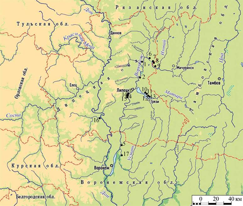 Рисунок 1 – Карта ранненеолитических памятников, упоминаемых в статье. 1 – Доброе 9; 2 – Капитанщино 7; 3 – Карамышево 5; 4 – Карамышево 1; 5 – Ступино; 6 – Васильевский Кордон 3; 7 – Васильевский Кордон 5; 8 – Васильевский Кордон 7; 9 – Васильевский Кордон 1; 10 – Рыбное Озеро I. Пункт 201; 11 – Рыбное Озеро II. Пункт 202; 12 – Ярлуковская Протока. Пункт 242; 13 – Ярлуковская Протока. Пункт 222; 14 – Карамышево 9; 15 – Карамышево 19; 16 – Ксизово 6; 17 – Университетская 3