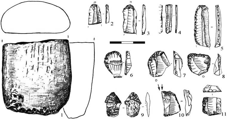 Остальные находки представлены 13 отщепами, одним кремневым обломком, двумя пластинчатыми отщепами (рис. 7: 8, 11) и одной миниатюрной пластиной из черного мелового высококачественного кремня (рис. 7: 4).