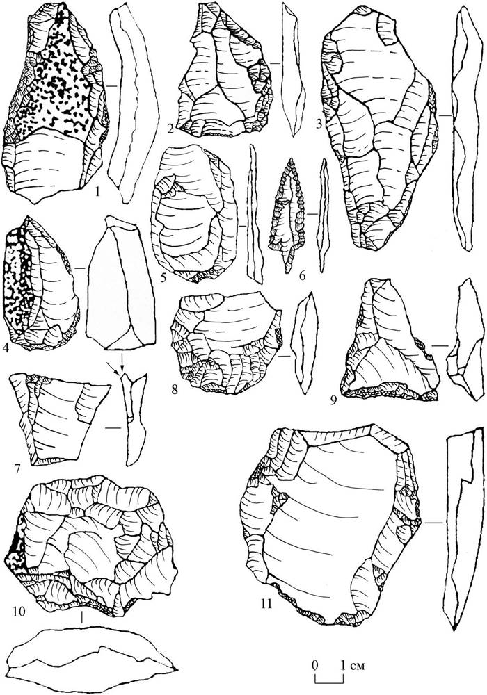 Рисунок 2 – Стоянка Ступино. 1–11 – изделия из камня карамышевской культуры (по: [4])