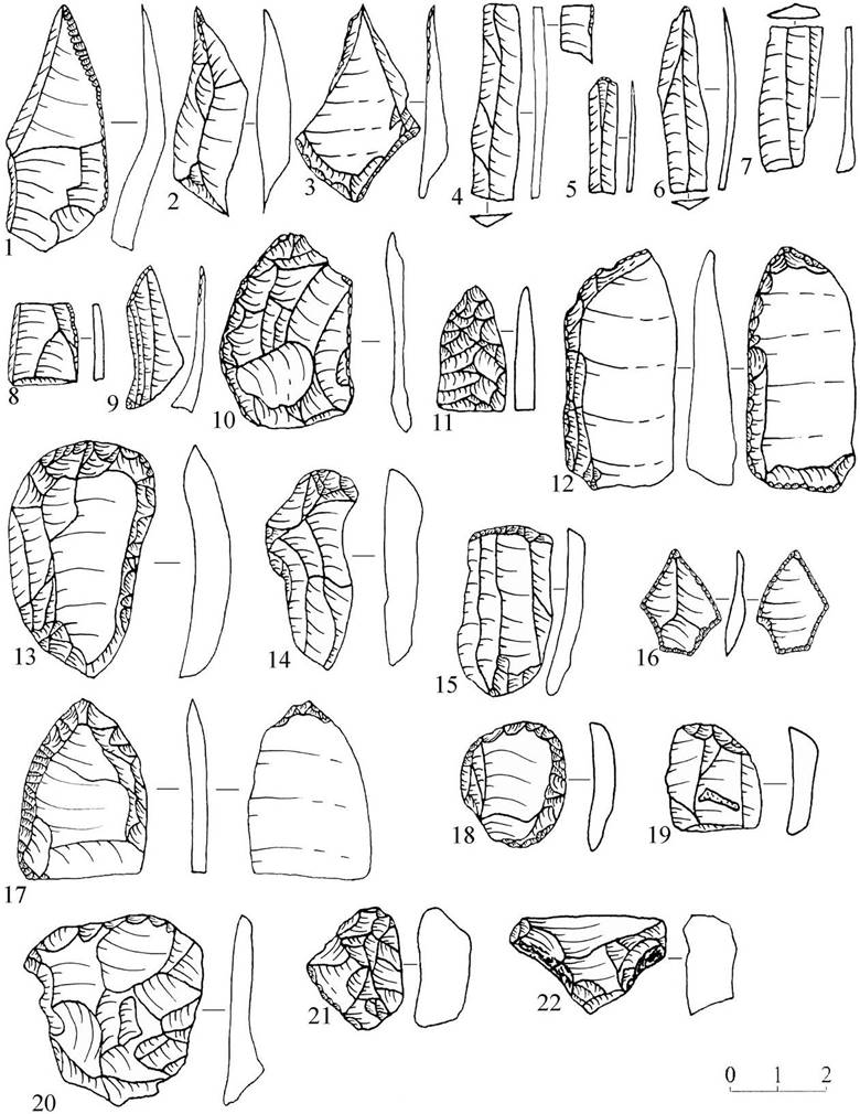 Рисунок 4 – Каменный инвентарь поселения Карамышево 1. 1–22 – орудия из кремня