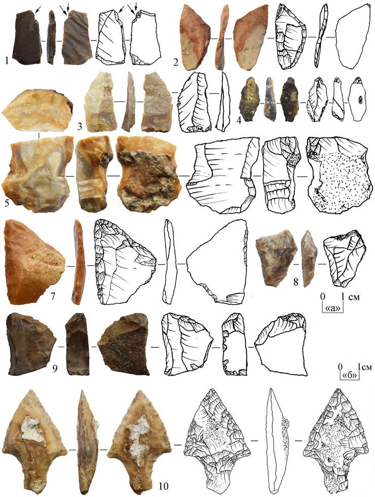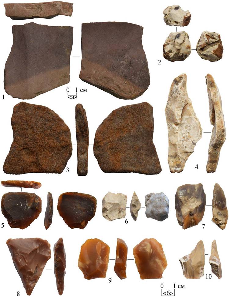 Рисунок 6 – Каменный инвентарь стоянки Доброе 9. 1, 3 – масштаб «а», 2, 4–10 – масштаб «б»