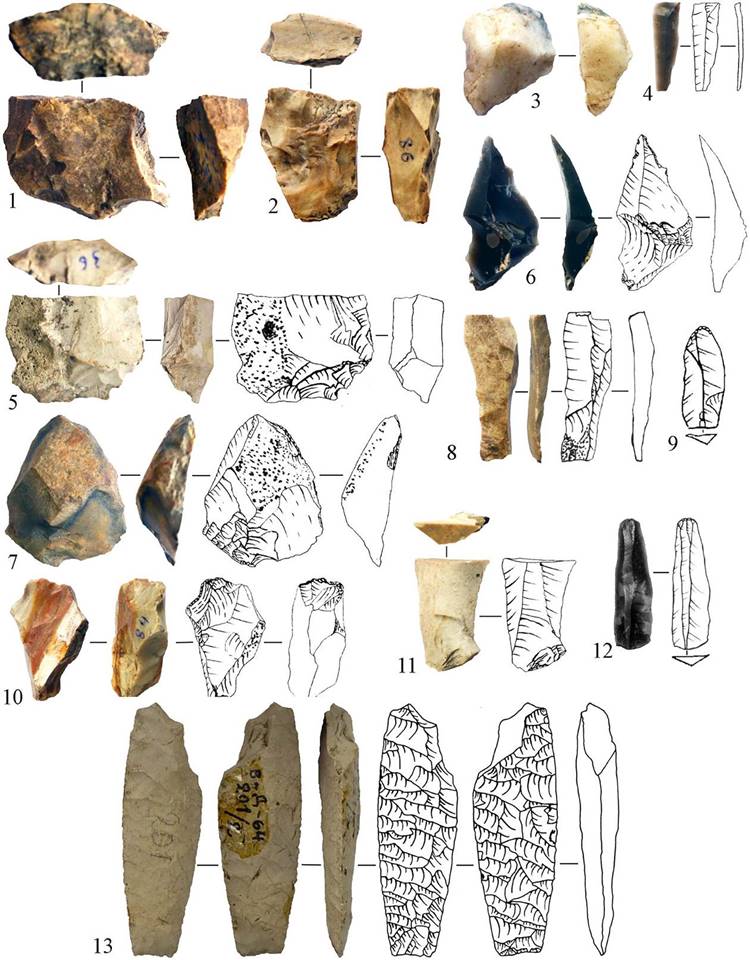 – обращает на себя внимание тот факт, что преобладающая часть пластин из чёрного высококачественного мелового кремня не местного происхождения и имеет миниатюрные размеры, тогда как кварцитовые пластины, наоборот, крупные или средние по величине;