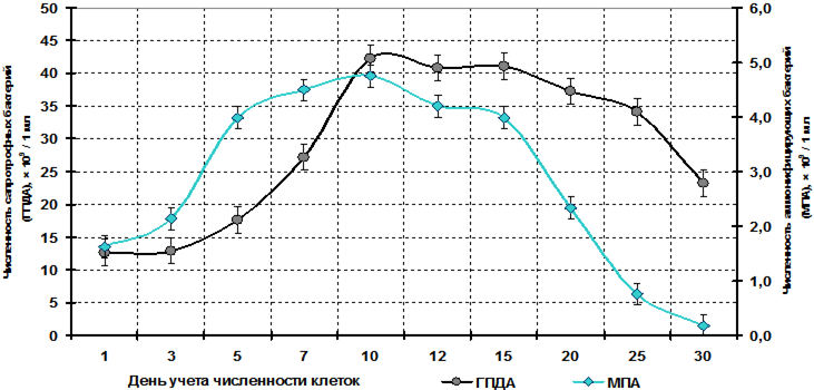 Рисунок 1 – Динамика численности живых клеток общего сапротрофного (ГПДА) и аммонифицирующего (МПА) бактериальных комплексов при биохимической деградации диатомита