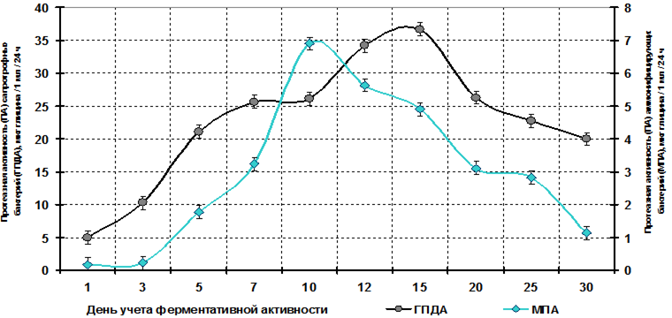 Аналогично численности жизнеспособных клеток пик протеазной активности также пришелся на 10–15-й дни и также в существенной разнице различался между культуральными жидкостями: до 36,66 мкг глицина/1 мл/24 ч. по ГПДА-культуре и до 6,90 мкг глицина/1 мл/24 ч. по МПА-культуре.
