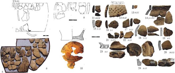 Рисунок 1 – Поселение Березовая Слободка II–III. Неорнаментированная и накольчатая керамика. Раскоп 6 1999–2000 года: 1–4 – графическая реконструкция сосудов; 5 – фрагменты сосуда № 1 из жилища; 6 – фрагменты сосуда № 2 (из хозяйственной ямы), № 3, 4 из скопления в жилище. Раскоп 7 2002 года: 7–9 – фрагменты венчиков и стенок, 10 – плоско-вогнутое дно. Раскоп 8 2005 года: 11–19 – фрагменты венчиков и стенок, 21–24 – фрагменты плоских днищ. Раскоп 9 2014 года: 20 – фрагмент стенки