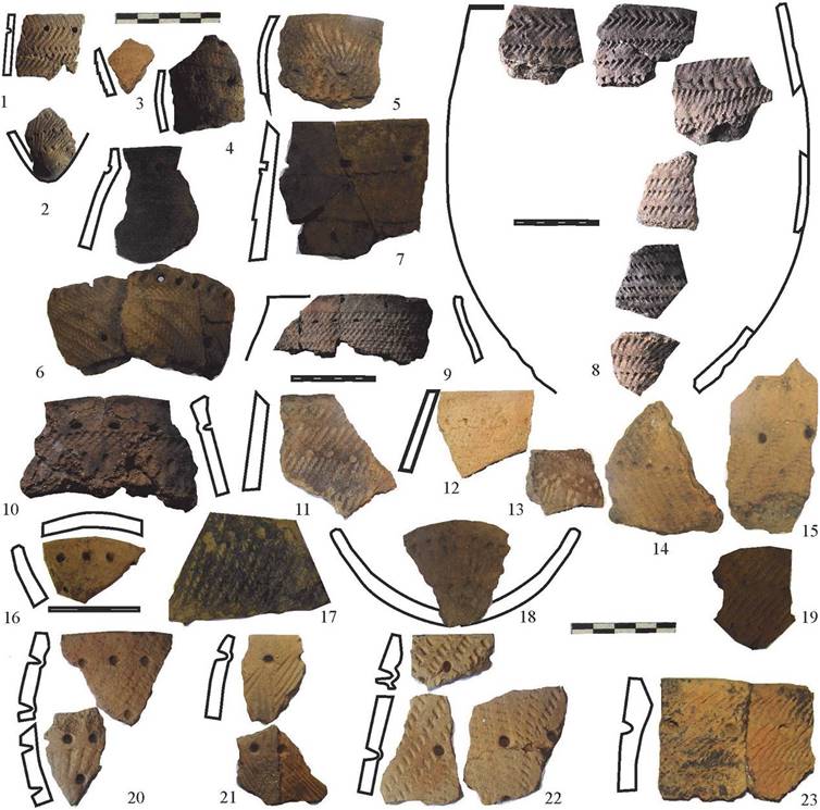 Рисунок 2 – Гребенчатая и керамика сперрингс в Юго-Восточном Прионежье. Поселение Тудозеро-V: керамика с гребенчатым (1–4, 6–8, 10, 11), позвонковым (9, 12, 15), отступающим (5, 14) и накольчато-отступающим (13) орнаментом. Поселение Кемское-III: керамика с накольчатым (16, 22), гребенчатым (17–19), позвонковым (20) и прочерченным (21, 23) орнаментом
