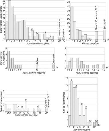 Рисунок 2 – Количество керамических сосудов в изученных контекстах. I – общее количество; II – общее количество с учетом сохранности и состояния залегания в слое; III–VI – количество согласно культурно-хронологической атрибуции: III – ранний неолит (памятники разной культурной принадлежности; IV – средний неолит (памятники с гребенчато-ямочной керамикой, преимущественно льяловского типа); V – финальный неолит – энеолит (чужъяёльская культура и сопряженные с нею комплексы); VI – энеолит (чойновтинская или гаринская культура, включая памятники типа Галово II)