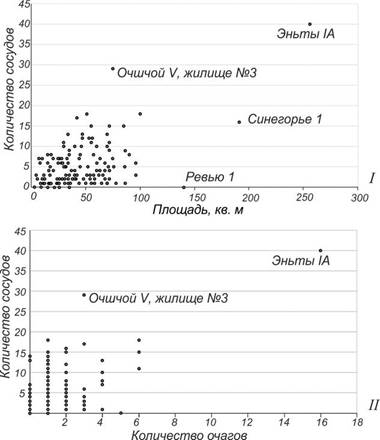 Оба графика показывают слабую зависимость числа сосудов от площади жилищ и скоплений и от количества очагов в их контекстах. Вероятно, это связано с учетом всей совокупности посуды. В дальнейшем необходимо по возможности отделить сосуды очень малых и малых объемов, явно связанных с индивидуальным потреблением, ритуальной практикой и, возможно, т.н. ученическими образцами. И попытаться произвести расчет по емкостям для коллективного потребления или приготовления пищи. В какой-то мере искажение информации связано с тем, что не во всех контекстах исследователи могли обнаружить очаги (или не все из них), которые, как правило, не были конструктивно оформлены и из-за кратковременности (или других особенностей) их использования не оставили никаких следов.
