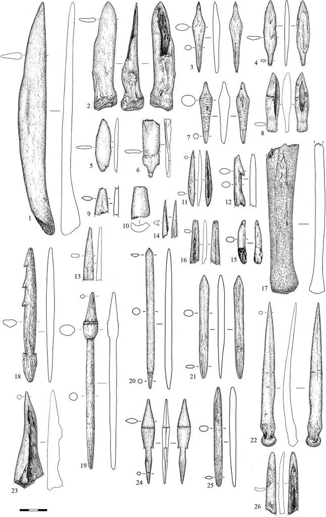 Рисунок 1 – Изделия из кости, рога и зубов. 1–15 – Сертея X; 16–26 – Рудня Сертейская. 1, 2 – ножи; 3, 4, 7, 9, 19–21, 24, 25 – наконечники стрел; 5, 6, 8 – заготовки; 11 – остриё; 12 – зубчатое остриё; 15 – подвеска; 13, 22, 23 – проколки; 18 – наконечник остроги; 10, 16, 26 – фрагменты изделий со следами обработки; 14, 17 – без следов обработки и использования (рис. А.А. Малютиной)