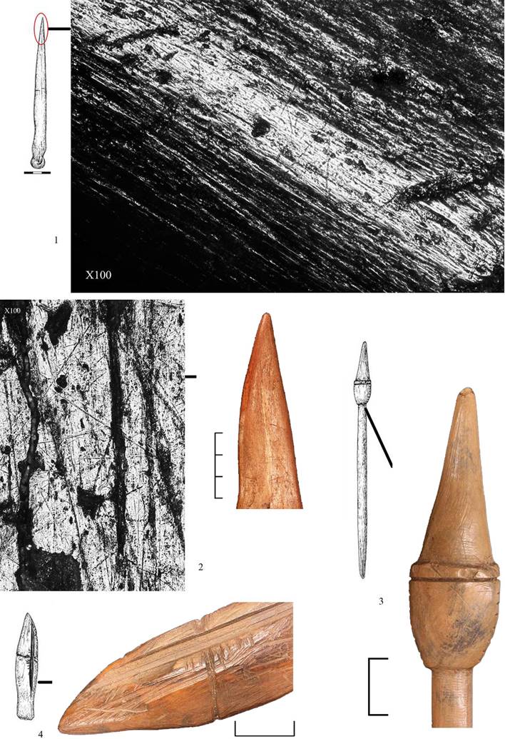 Одно остриё (рис. 1: 11), заготовкой для которого послужил фрагмент трубчатой кости, является, скорее всего, элементом составного изделия. На гранях широкого, прямоугольного в сечении, конца предмета сохранились следы строгания. На противоположном остром конце, круглом в сечении, технологических следов практически не сохранилось. Поверхность острого конца отличается интенсивным блеском, микрорельеф мягко сглажен, а тонкие линейные следы располагаются в виде разнонаправленных единичных линий и перекрестий. Широкий плоский конец следов использования не имеет. Этот конец изделия был вставлен в рукоять (или черешок), тогда как острый кончик являлся рабочим. Характер следов утилитарного износа позволяет предположить, что это были мягкие материалы, однако реконструкция конструктивных особенностей орудия и способов его использования затруднена.