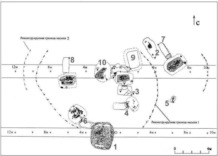 Рисунок 8 – План кургана 4 могильника Кунаковский-2 (цифрами на плане обозначены номера погребений)